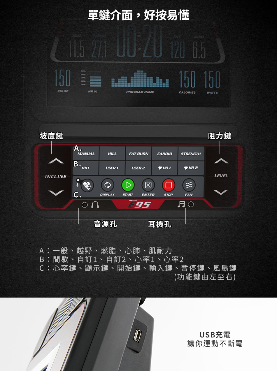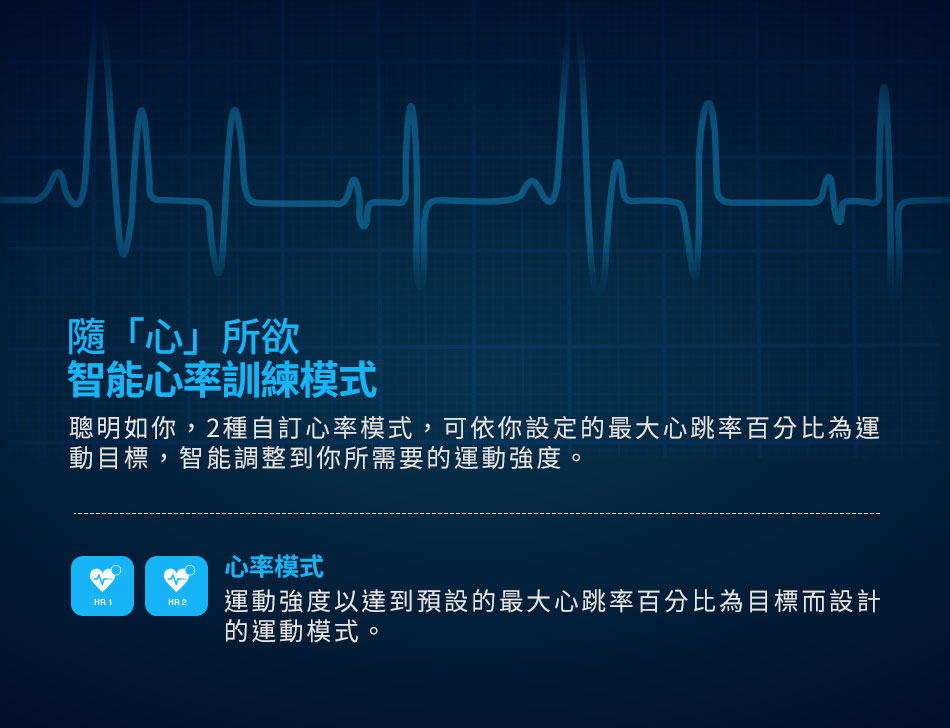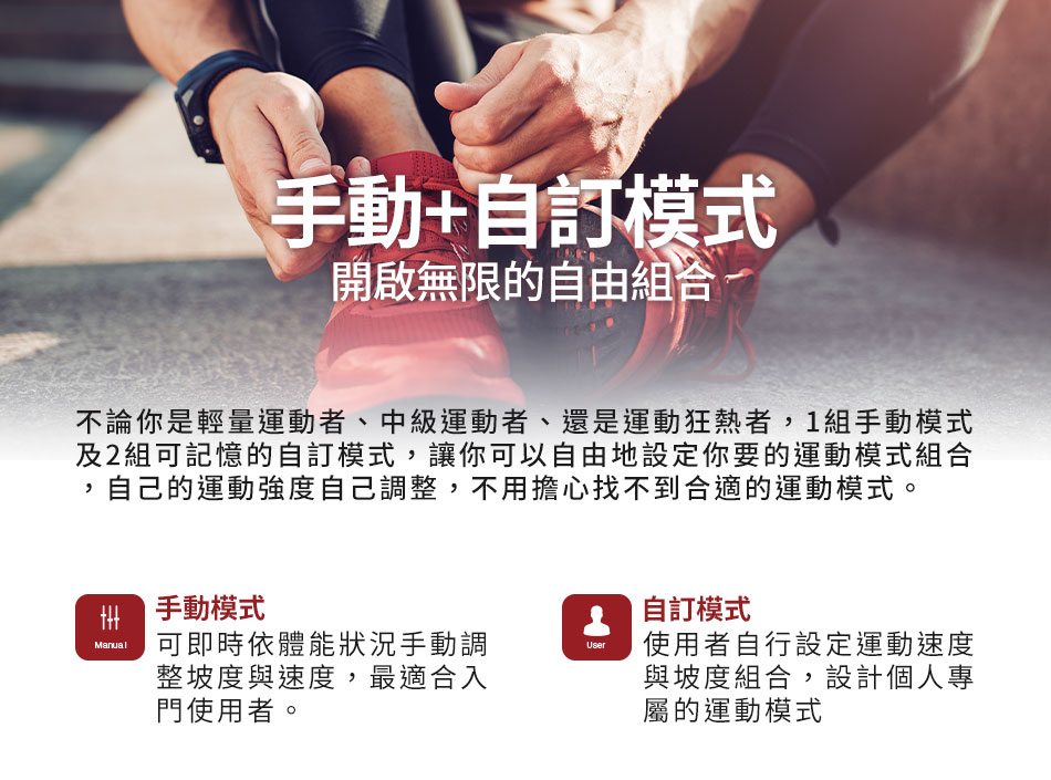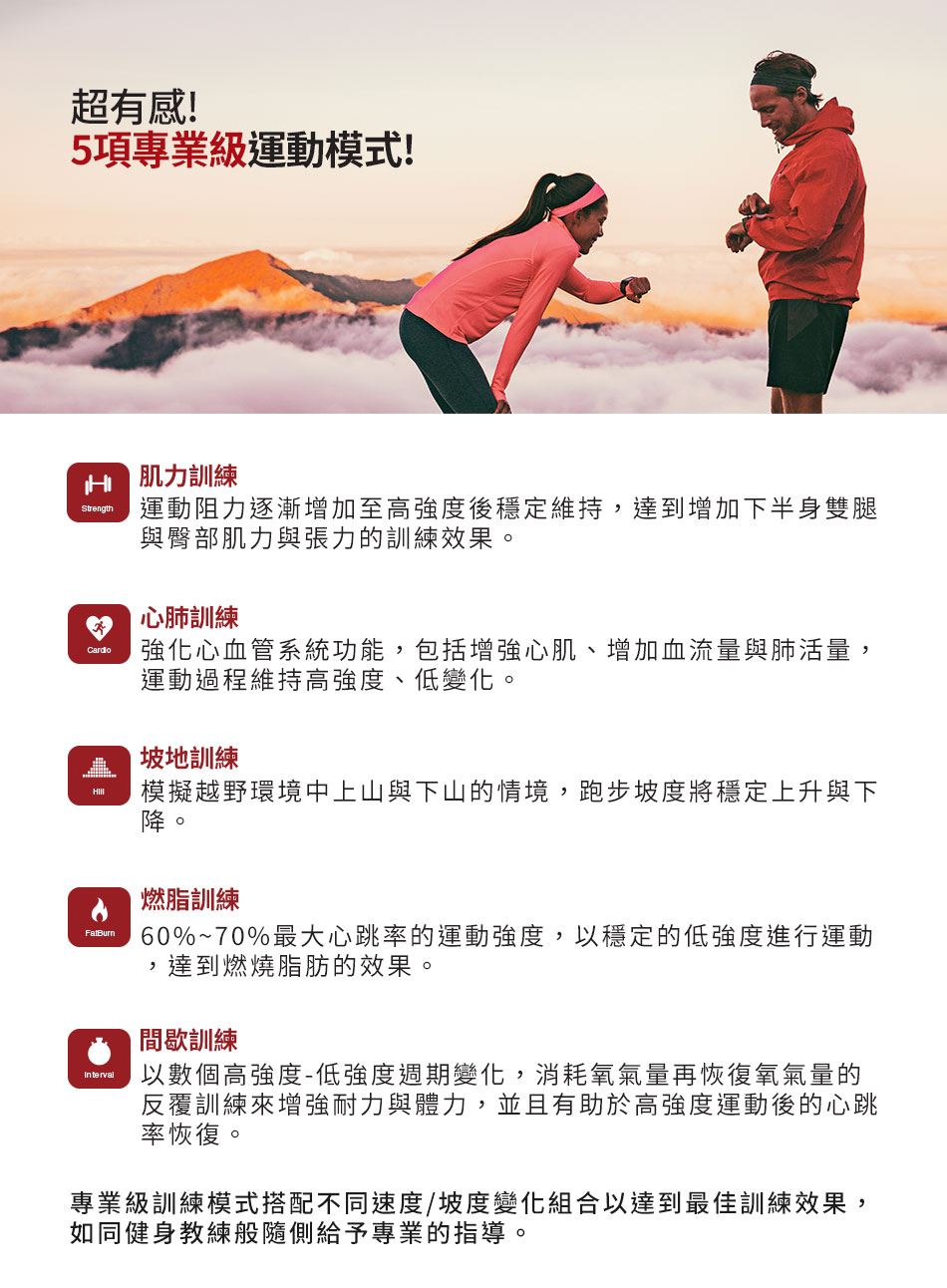 包括5種體適能專家設計的運動模式,2種心率模式、1種手動模式、2種自訂模式,全方位滿足居家運動訓練需求
