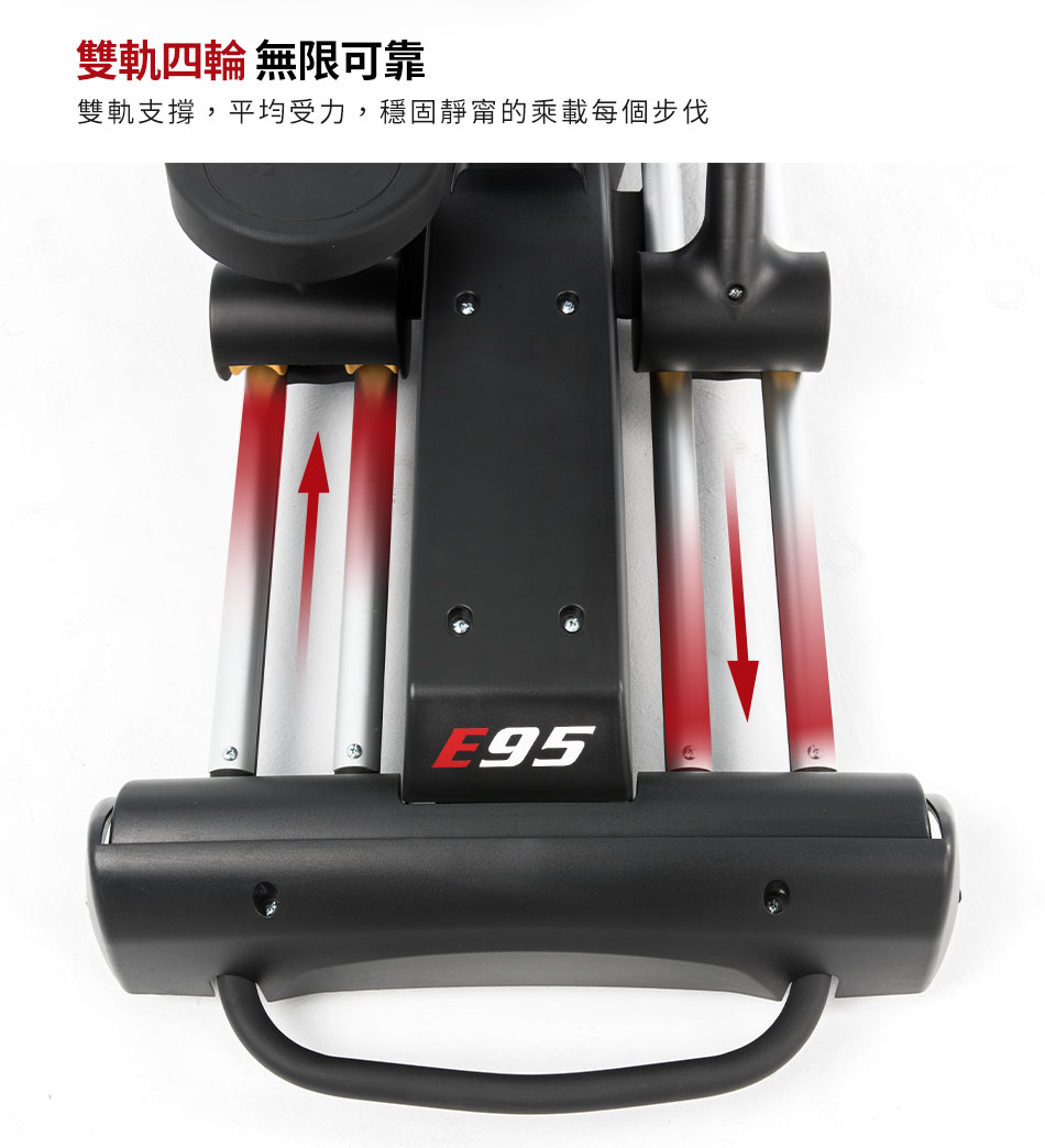 ◆ 前置式12 Kgs飛輪重量系統與雙軌滾輪滑軌設計