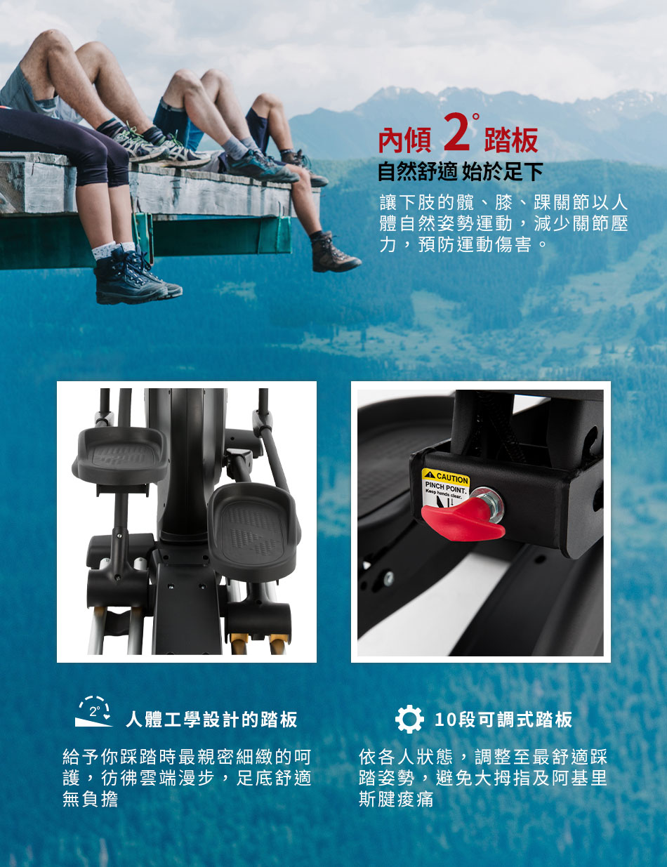 跨步向前、抬腿、下踩、後拉都恰到好處,滿足150-200公分身材,大角度關節活動,激發每一吋肌肉踏出你的健康體能